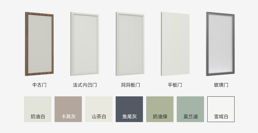 提供中古門、法式內凹門、洞洞板門、平板門、玻璃門等五種門型,搭配7種高顏值配色,適配北歐、現代、輕奢等多種裝修風格。